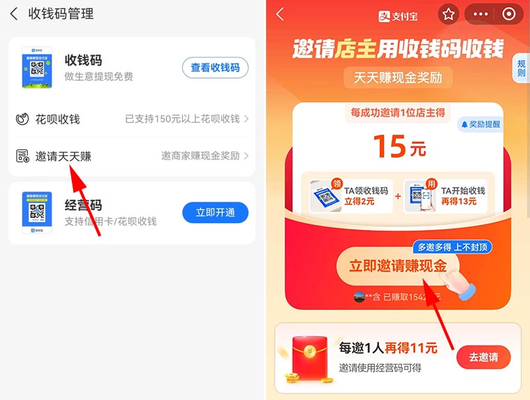 只要他人通过邀请码领取收款码,就可以立得2元,后续使用还可以获得13元。通过支付宝滚动的收益可以看到,一些人推广收款码都赚了几万块。我就用家人的支付宝领了一个,2元立马到账。