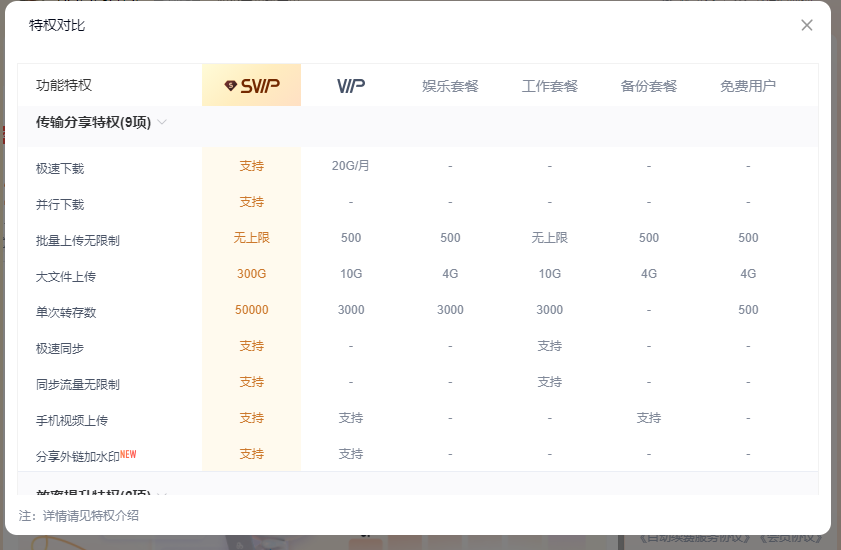 通过百度网盘会员特权列表看,要想使用网盘的全部功能,还必须开通SVIP才行,一年接近200元。即使VIP单次上传也限制了500个文件的数量。吃相着实有些难看。